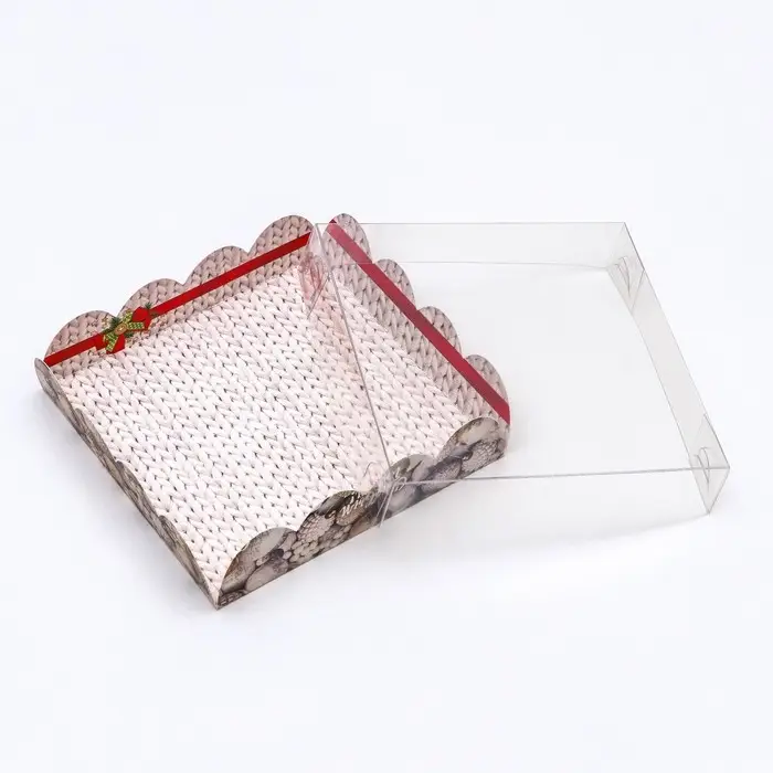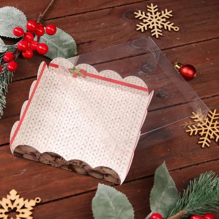 Коробка для печенья с прозрачной крышкой, можно видеть содержимое коробки. Прекрасно подойдет для десертов, можно использовать для праздничного декора.