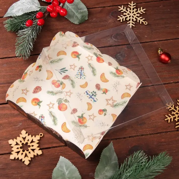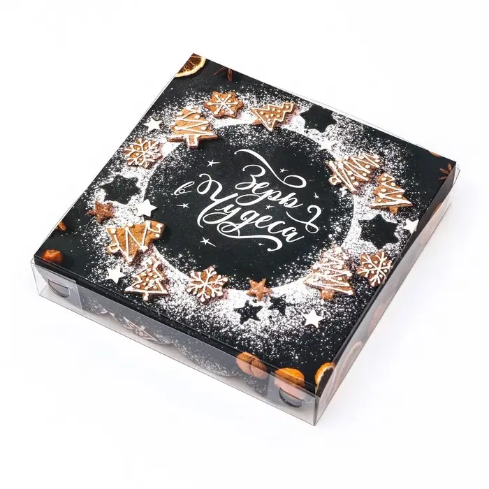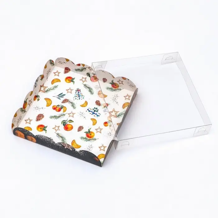 Коробка для печенья с прозрачной крышкой, можно видеть содержимое коробки. Прекрасно подойдет для десертов, можно использовать для праздничного декора.