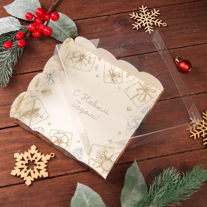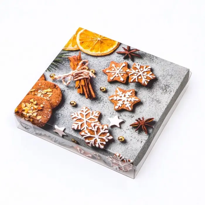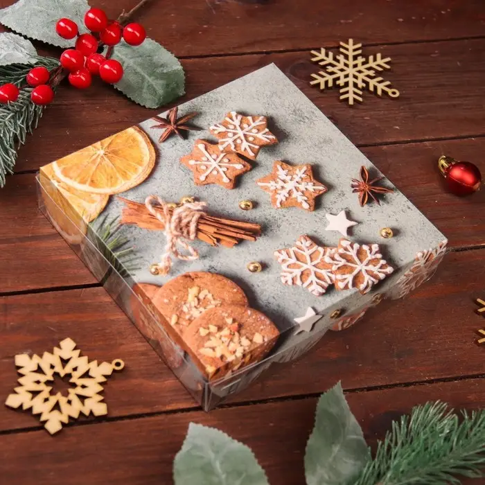 Коробка для печенья с прозрачной крышкой, можно видеть содержимое коробки. Прекрасно подойдет для десертов, можно использовать для праздничного декора.