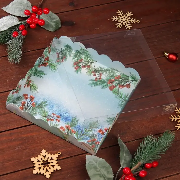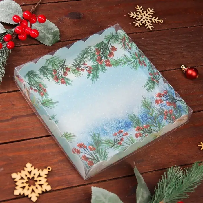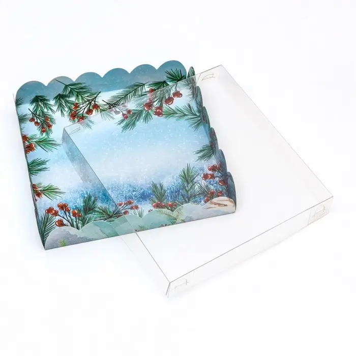Коробка для печенья с прозрачной крышкой, можно видеть содержимое коробки. Прекрасно подойдет для десертов, можно использовать для праздничного декора.