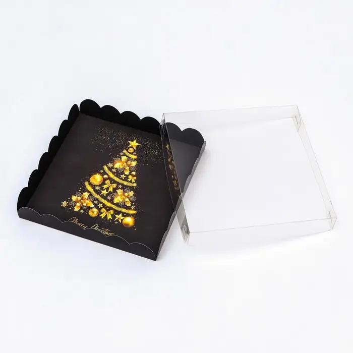 Коробка для печенья с прозрачной крышкой, можно видеть содержимое коробки. Прекрасно подойдет для десертов, можно использовать для праздничного декора.