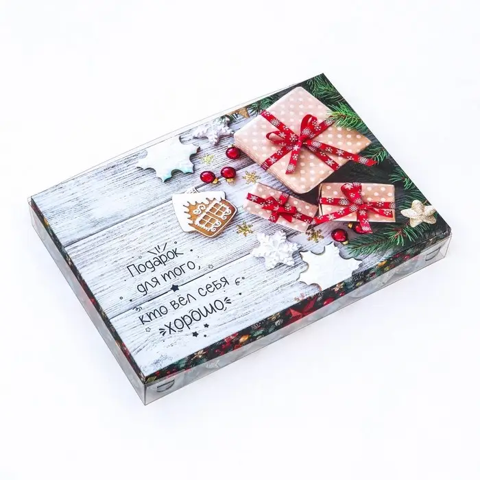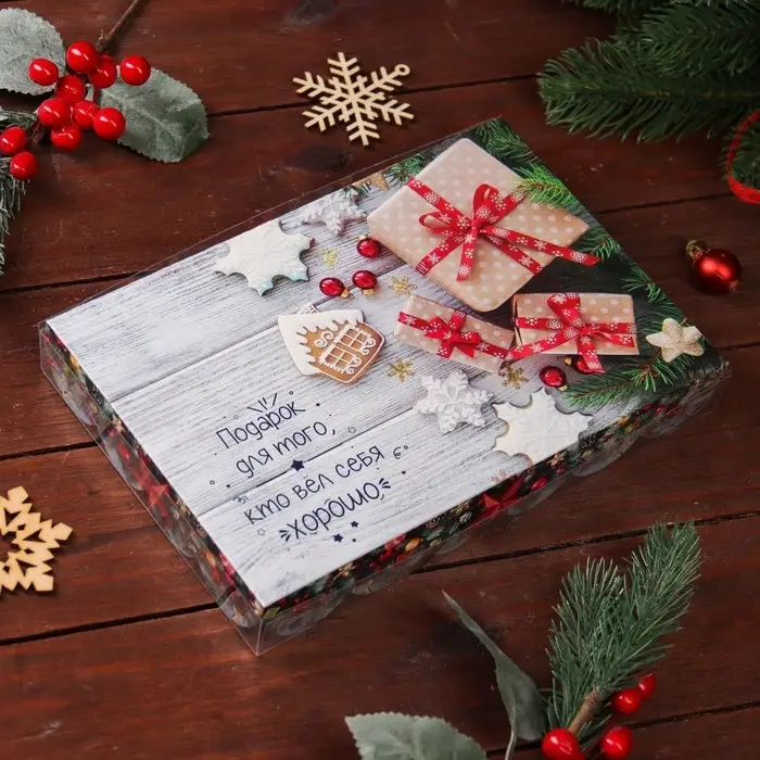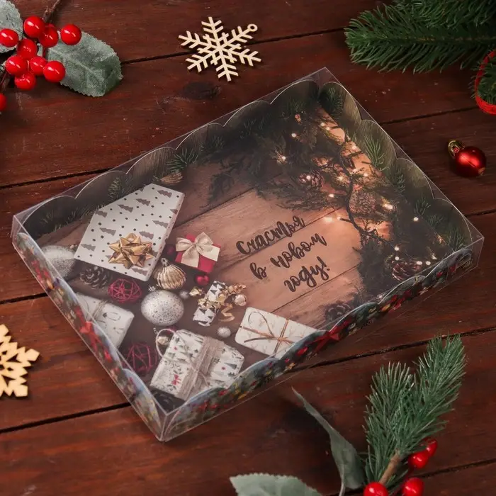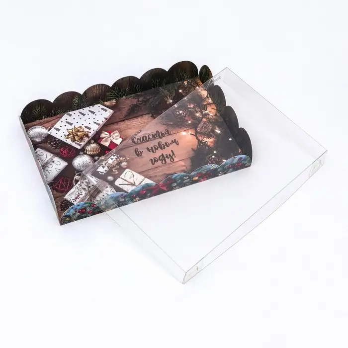 Коробка для печенья с прозрачной крышкой, можно видеть содержимое коробки. Прекрасно подойдет для десертов, можно использовать для праздничного декора.