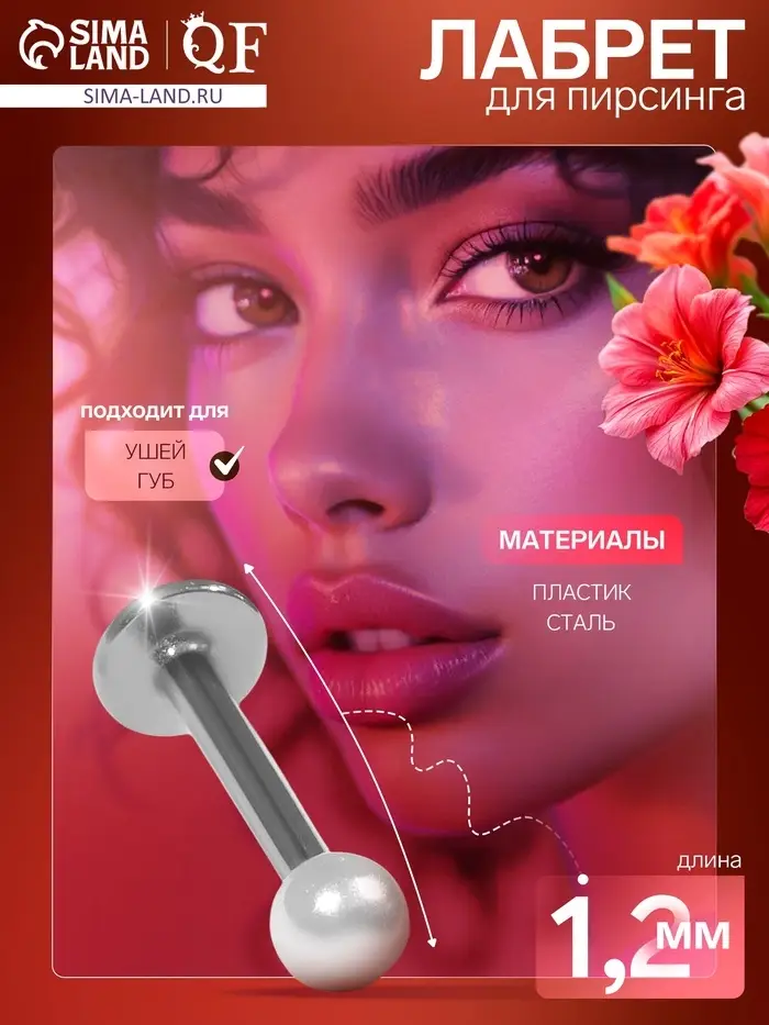 Пирсинг лабрет «Жемчуг», L=1.2 мм, белый в серебре