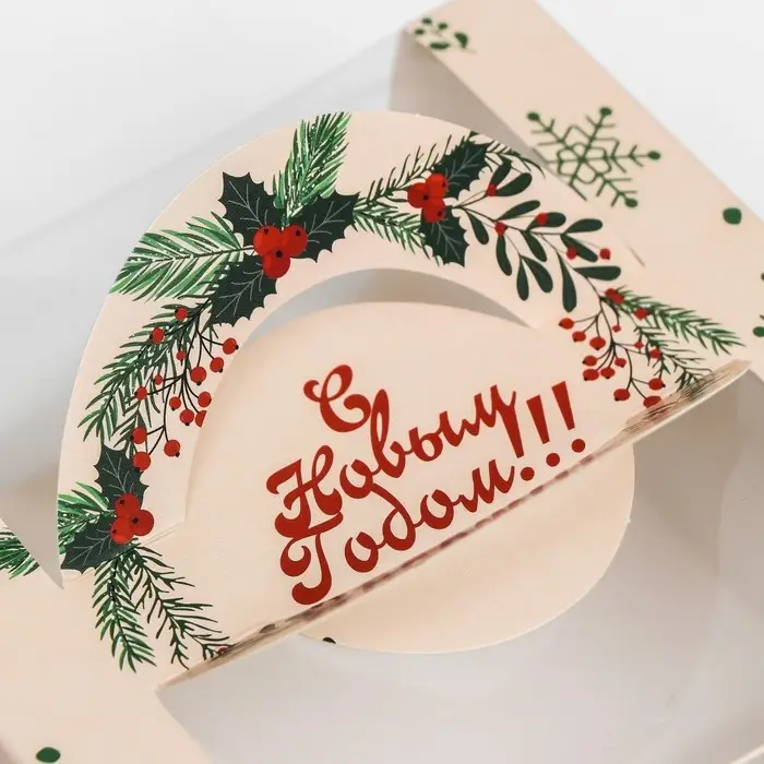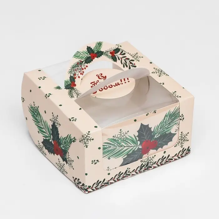 Коробка под бенто - торт с окном «Новогодняя с шишками», 14×14×8 см, Новый год