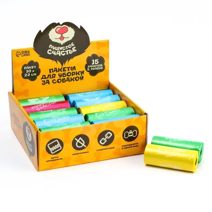 Пакеты для уборки за собаками в шоубоксе «Пушистое счастье» (20 рулонов по 15 пакетов, 22 х 30 см)