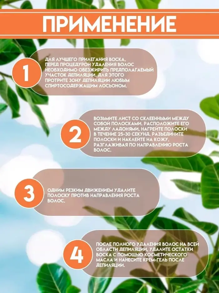 Способ применения: Хорошо разогрейте трением в руках, чтобы подготовить воск. Аккуратно разделите восковую полоску на 2 части. Нанесите её на место депиляции, прижмите и хорошо разотрите по направлению роста волос. Придерживая кожу одной рукой, другой резким и быстрым движением снимите полоску по направлению против роста волос. После завершения процедуры депиляции протрите кожу салфеткой, пропитанной маслом.