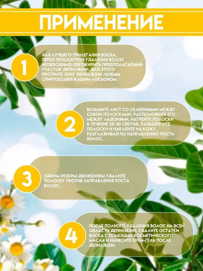 Восковые полоски с экстрактом ромашки идеально подходят для быстрого и эффективного удаления нежелательных волосков на лице. Они просты в использовании и сделают кожу гладкой надолго. Воск создан на основе натуральных смол хвойных дереьев, что позволяет максимально эффективно удалять волоски разной длины, включая самые короткие. Благодаря экстрату ромашки и витамину Е, кожа будет мягкой и увлажненной. Специальная ткань лишена эластичности, что дает возможность делать короткое резкое движение при отрыве полоски, предотвращая болезненные ощущения. Проведите тест на чувствительность: используйте полоску на небольшом участке предполагаемом для депиляци. Если в течение 24 часов не появилось никакой негативной реакции, полоски можно использовать.