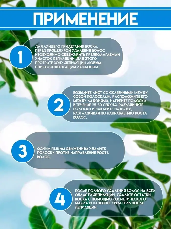 Важно: остатки воска удаляйте с помощью косметического масла. Не используйте водорастворимые и спиртосодержащие средства.