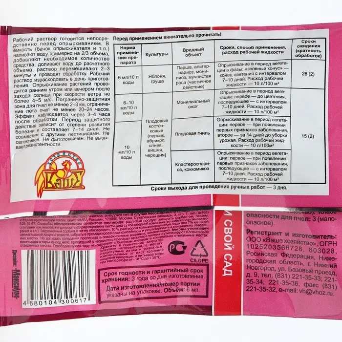 Хортон, КС (250 г/л ципродинила). Фунгицид.Превосходная защита как семечковых (яблоня, груша), так и косточковых (вишня, слива, абрикосы) культур. Специализированный препарат для защиты плодового сада от основных болезней: коккомикоза, монилиоза, кластероспориоза, парши, монилиального ожога, плодовой гнили.Превосходная защита как семечковых (яблоня, груша), так и косточковых (вишня, слива, абрикосы) культур.Эффективно работает даже при низких температурах воздуха (в начале сезона).Справляется даже с устойчивыми формами заболеваний.После обработки быстро впитывается растениями и уже через 2-3 часа не боится смывания дождем.Не токсичен для пчёл. Рабочий раствор готовится непосредственно перед опрыскиванием. В ёмкость (бачок опрыскивателя и т. п.) наливают воду примерно на 2/3 объема, добавляют необходимое количество средства, доливают воду до расчетного объема, раствор перемешивают 2-3 минуты и проводят обработку.Рабочий раствор израсходовать в день приготовления. Опрыскивание растений проводится ранним утром или вечером после захода солнца при скорости ветра не более 4—5 м/с. Погранично-защитная зона для пчел не менее 2-3 км, ограничение лета пчел не менее 20-24 часов.
