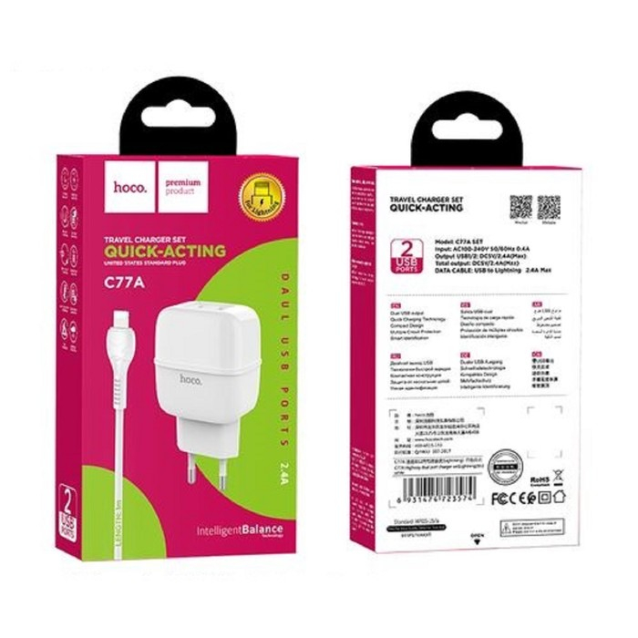Сетевое зарядное устройство Hoco C77A, 2хUSB, 2.4 А, кабель Lightning, 1 м, белое