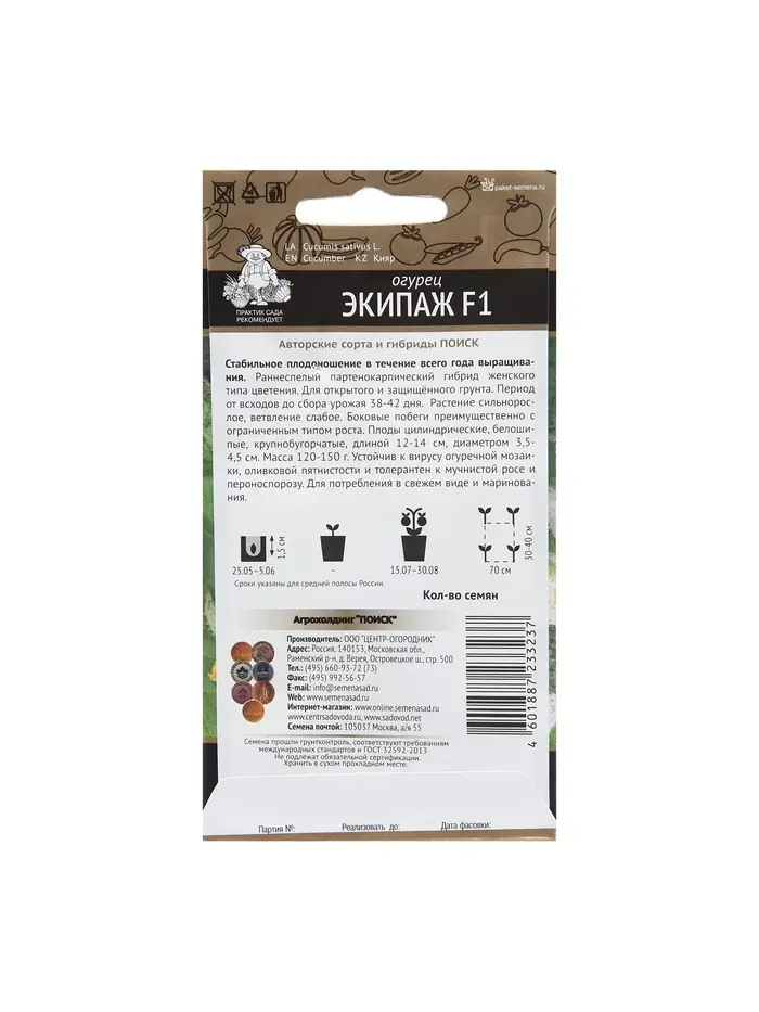 Огурец Экипаж F1 - стабильность и длительность плодоношения в любых условиях Период от всходов до начала плодоношения 38-42 дня. Растение женского типа цветения, с ограниченным ветвлением боковых побегов. В узле формируются 1-2 зеленца. Плоды 11-13 см, цилиндрические, белошипые, тёмно-зелёной окраски. Устойчив к мучнистой росе, оливковой пятнистости и вирусу огуречной мозаики.