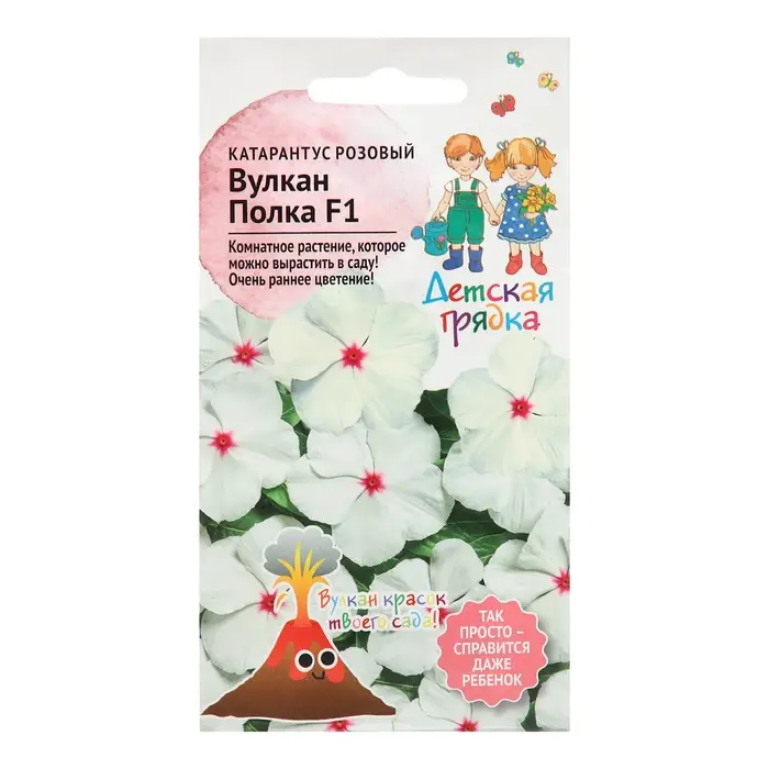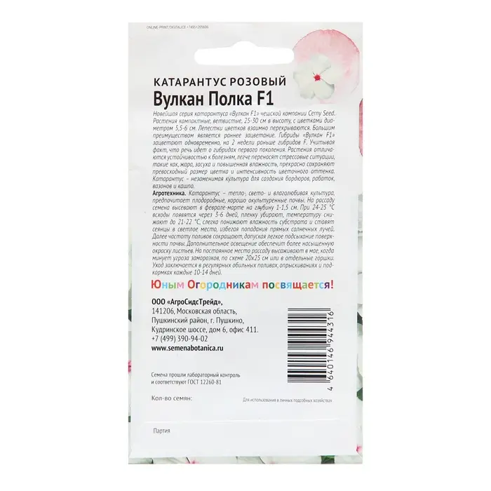 Новейшая сериякатарантуса«ВулканF1» чешской компании Cerny Seed. Растения компактные, ветвистые, 25–30 см в высоту, с цветками диаметром 5,5–6 см. Лепестки цветков взаимно перекрываются. Большим преимуществом является раннее зацветание. Гибриды «Вулкан 1» зацветают одновременно, на 2 недели раньше на две недели раньше гибридов. F Учитывая факт, что речь идет о гибридах первого поколения. Растения отличаются устойчивостью к болезням, легче переносят стрессовые ситуации, такие как, жару, засуху и повышенную влажность, прекрасно сохраняют превосходный размер цветка и интенсивность цветочного оттенка. Катарантус – незаменимая культура для создания бордюров, рабаток, вазонов и кашпо. Агротехника: Катарантус – тепло-, свето- и влаголюбивая культура, предпочитает плодородные хорошо окультуренные почвы. На рассаду семена высевают в феврале-марте на глубину 1-1,5см. При 24-25°С всходы появятся через 3-6 дней, пленку убирают, температуру снижают до 21-22°С, слегка понижают влажность субстрата и ставят сеянцы в светлое место, избегая попадания прямых солнечных лучей. Далее частоту поливов сокращают, допуская легкое подсыхание поверхности почвы. Дополнительное освещение обеспечит более насыщенную окраску листьев. На постоянное место рассаду высаживают в мае, когда минует угроза заморозков, по схеме 20х25 см или в отдельные горшки. Уход заключается в регулярных обильных поливах опрыскиваниях и подкормках каждые 10-14 дней. Штрих-код -