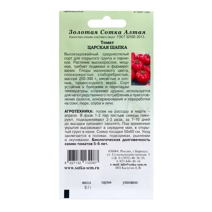 Семена Томат "Царская шапка", среднеспелый, 0,1 г
