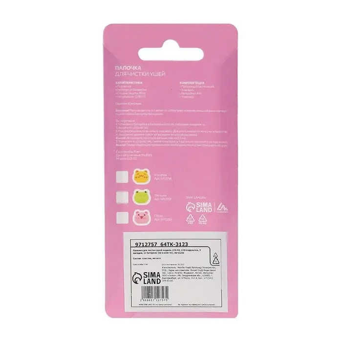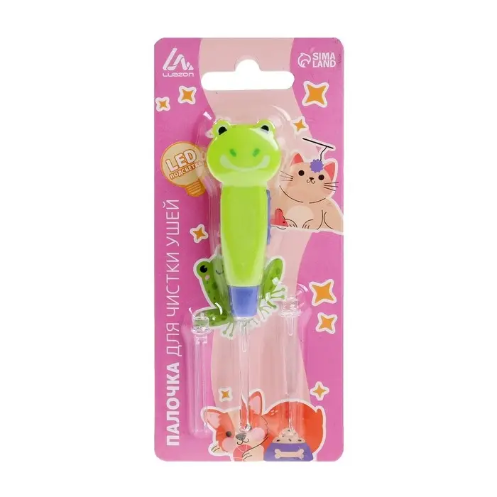 Палочка для чистки ушей LES-02, LED-подсветка, 3 насадки, от батареек, лягушка