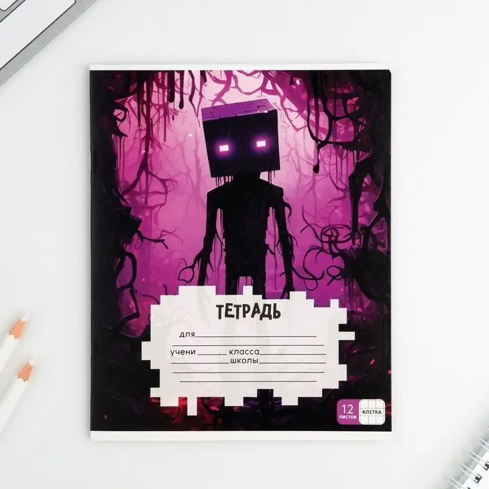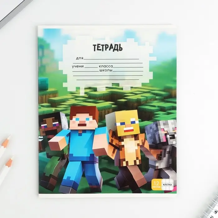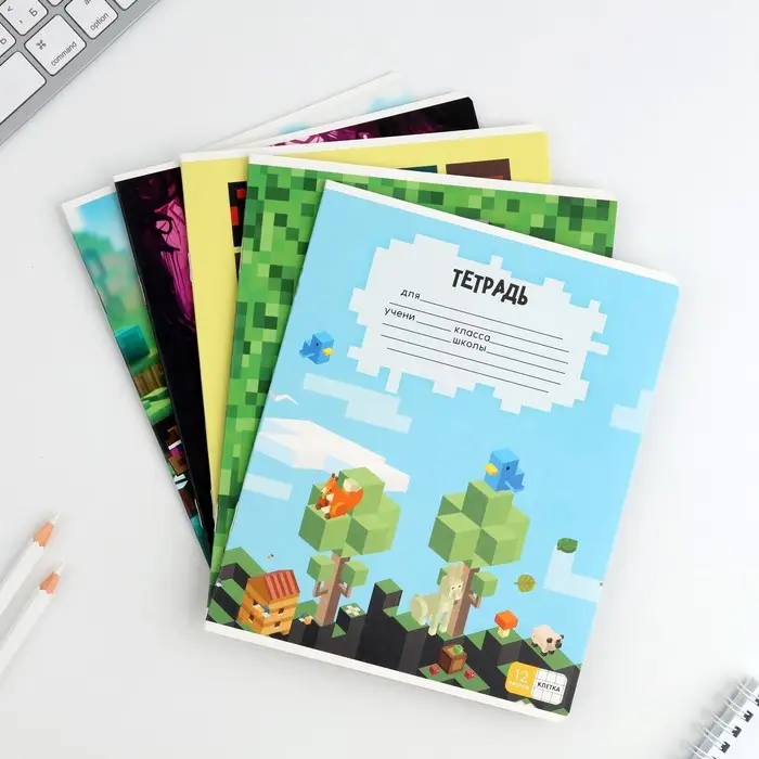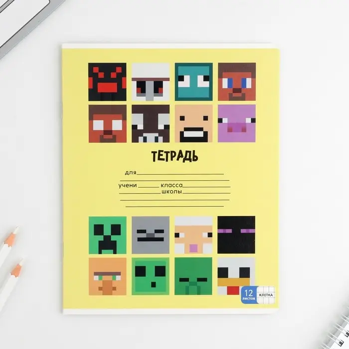 Тетрадь в клетку 12 листов А5, на скрепке «Пиксели», обложка мелованный картон, блок №1 белизна 96%, 5 видов МИКС