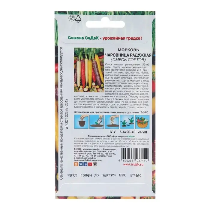 Смесь четырех раннеспелых (70-90дней) гибридов моркови: корнеплоды с ярко-фиолетовой кожицей и с оранжевой мякотью, ярко-желтые, белые, красно-алые, сочные, сладкие и ароматные по вкусу, хрустящие. Употребление разноцветных сортов моркови в пищу позволяет: укрепить иммунную систему, нормализовать уровень холестерина, снизить риск онкологических заболеваний, улучшить зрение, за счет наличия антоцианов, большого содержания бета-каротина, а также микроэлементов и витаминов. Поэтому полезнее всего употреблять морковь в пищу в свежем виде или использовать для приготовления свежевыжатого сока. Из-за необычного окраса эти корнеплоды используют для украшения различных блюд. Корнеплоды можно мариновать, варить, жарить, тушить, запекать.