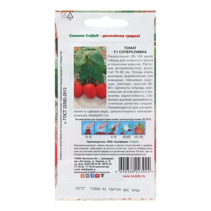 Раннеспелый (95-100 дней) гибрид для открытого грунта и пленочных укрытий. Растение детерминантное, высотой 70-80 см. Плоды очень красивые, выровненные, сливовидные, глянцевые, красные, плотные, массой 50-60 г. Ценность гибрида: комплексная устойчивость к болезням, жаростойкость, стабильно высокая урожайность, отличное качество плодов. Рекомендуется для употребления в свежем виде, цельноплодного консервирования, переработки.