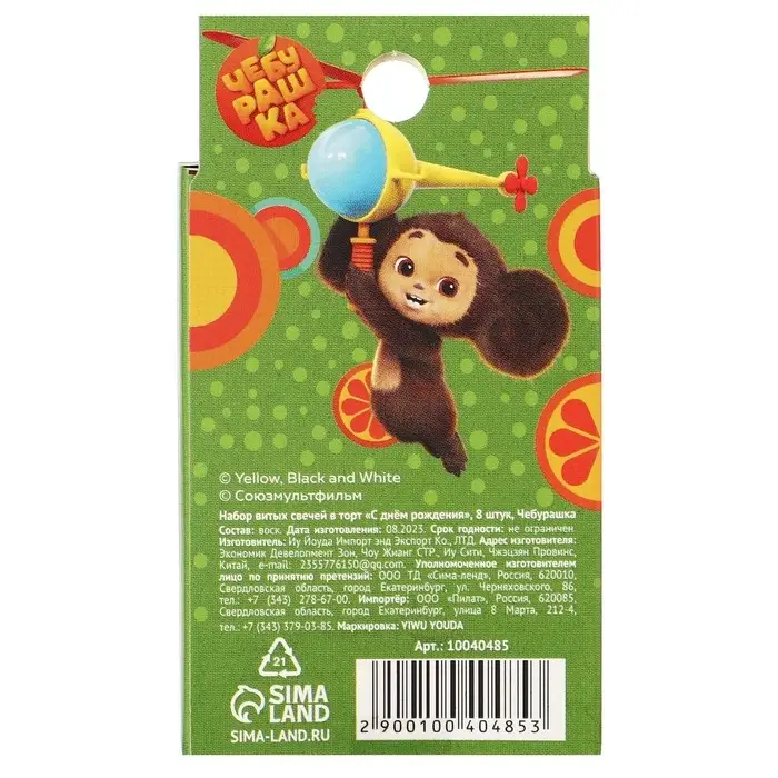Свечи для торта «С Днем Рождения», 8 штук, Чебурашка