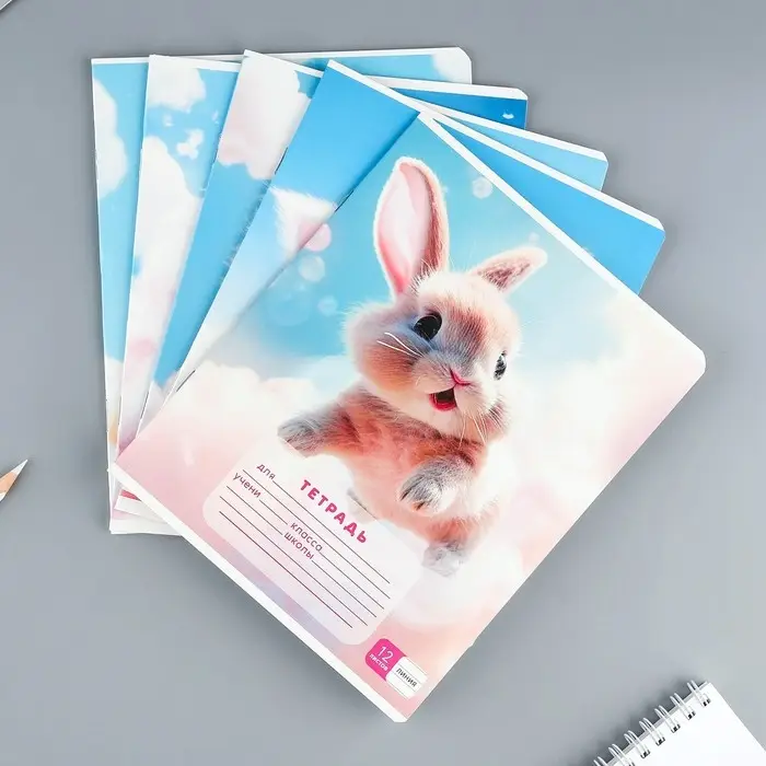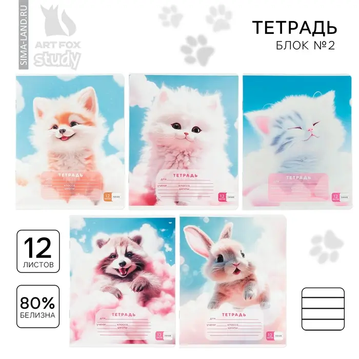 Тетрадь в линейку 12 листов А5, на скрепке «Пушистики», обложка мелованный картон, блок №2, 5 видов МИКС