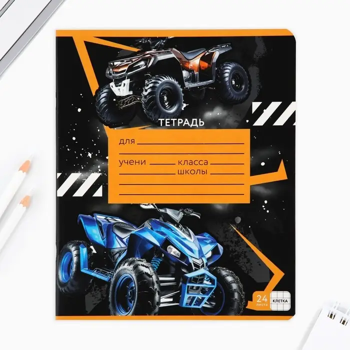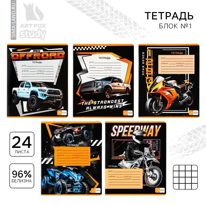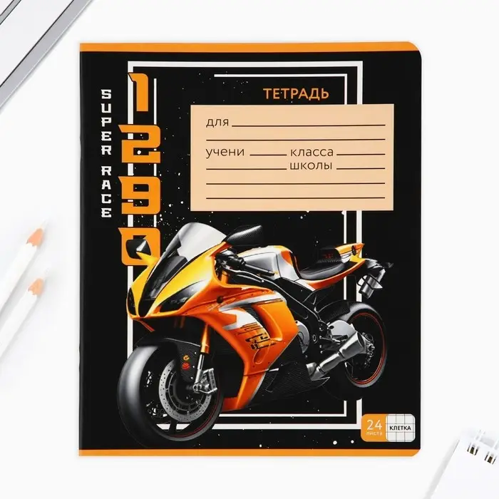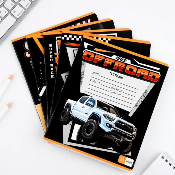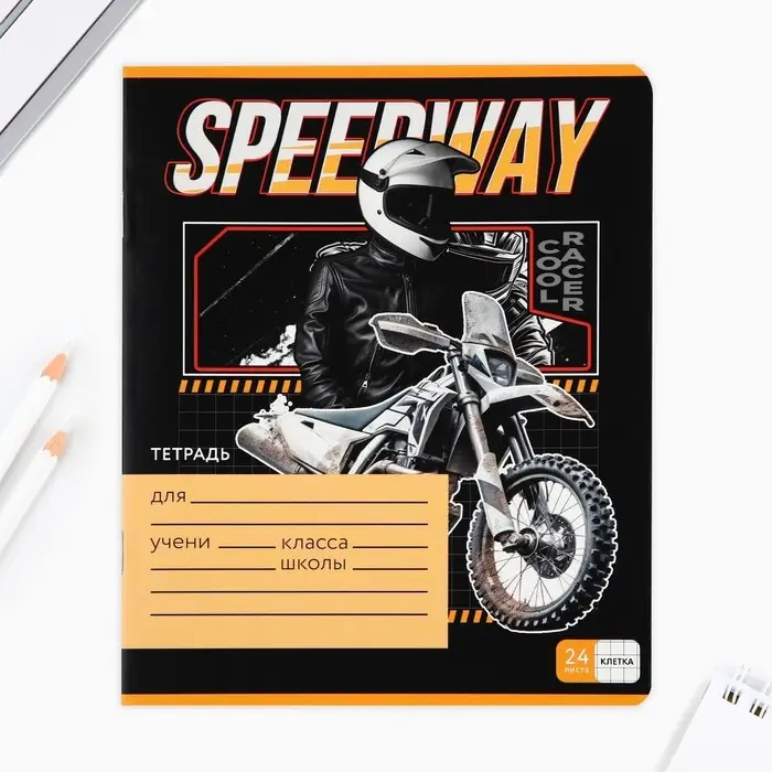 Тетрадь в клетку 24 листа А5, на скрепке «Гонщику», обложка мелованный картон, 5 видов МИКС