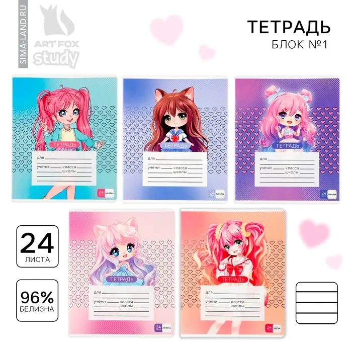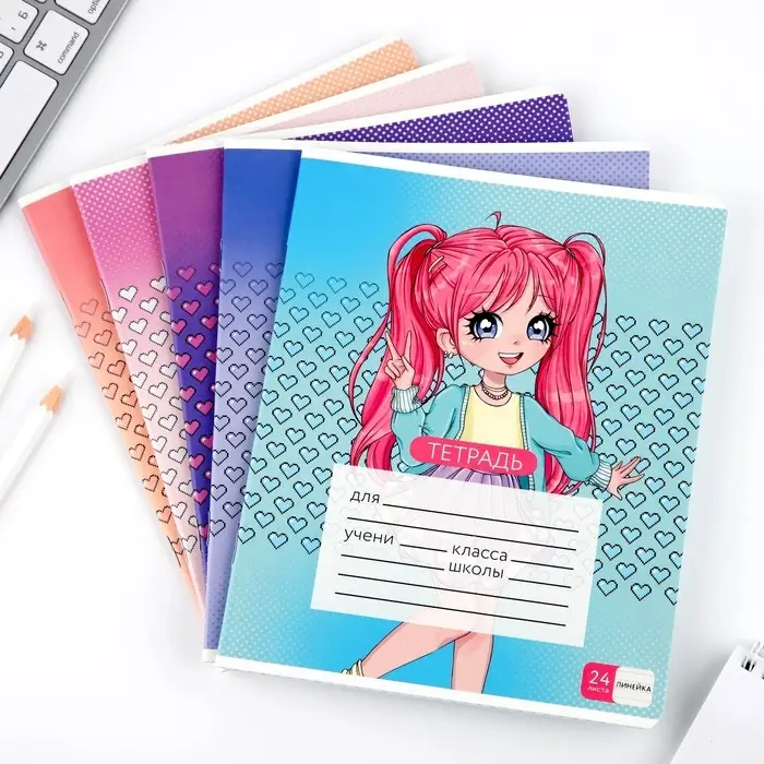 Тетрадь в линейку 24 листа А5, на скрепке «Аниме», обложка мелованный картон, 5 видов МИКС
