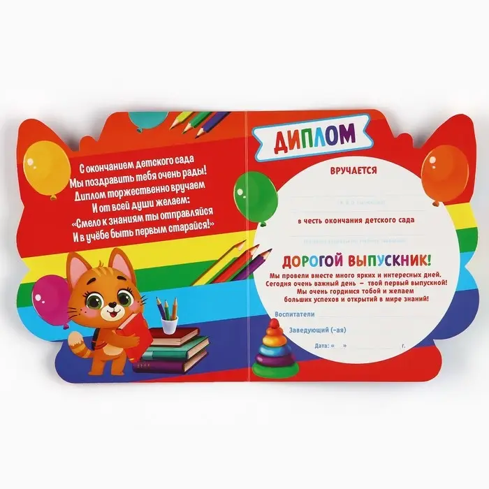 Яркий и красочный диплом не оставит ни одного ребенка равнодушным, поможет сделать выпускной особенно торжественным и останется на долгую память будущему школьнику.