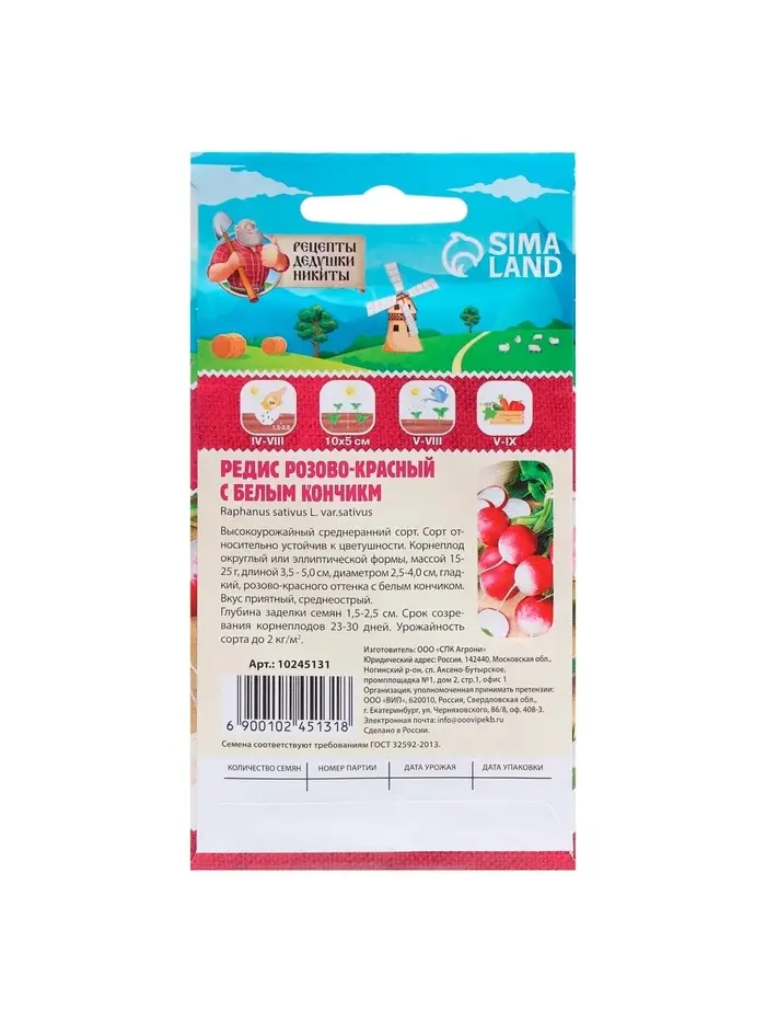 —Срок созревания: Редис "Розово-красный с белым кончиком" быстро созревает, всего за 20-25 дней после посева. Это позволяет наслаждаться свежими овощами уже в начале весны.