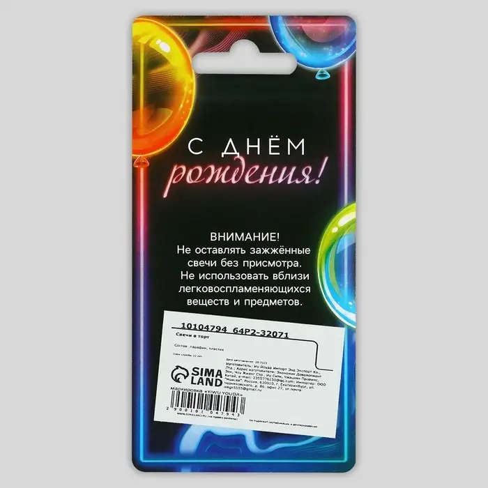 Свечи для торта на День рождения - неотъемлемая часть праздника. Украсьте угощение свечами, чтобы сделать особенный день в году ещё более ярким и незабываемым. Ведь задувание свечей вызывает бурные эмоции и у взрослых, и у детей, потому что в любом возрасте мы все мечтаем об исполнении желаний и для всех нас это один из самых трогательных и волшебных моментов. Яркие светящиеся в темноте свечи украсят праздничный стол и создадут нужную атмосферу. Изготовлены из высокоочищенного пищевого парафина, который не влияет на вкусовые качества блюд, а удобная упаковка помогает сохранять свечи при длительном хранении и транспортировке.