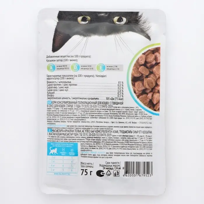 Гарантируемые показатели (на 100 г продукта) *: влажность –82 %, сырой протеин – 7,5%, сырой жир – 3,5 %, кальций – 0,3 %, фосфор – 0,2 %, энергетическая ценность – 71 ккал/299 кДж.