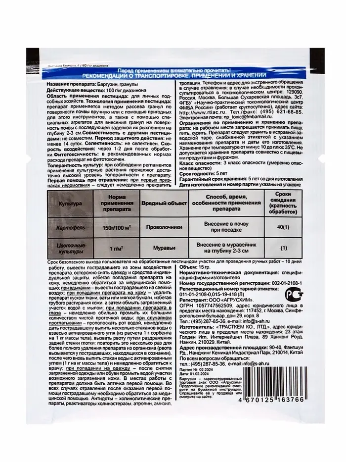 Баргузин — это гранулированный контактно-кишечный инсектицид широкого спектра. Он применяется в борьбе с вредителями–почвенниками: проволочниками, жужелицами, долгоносиками.Механизм действия: Препарат применяется путем внесения в почву гранул при посадке культуры и в период развития вредителей.После внесения в почву, действующее вещество препарата (диазинон) попадает в почвенный раствор, перераспределяется по площади участка и часть препарата проникает в защищаемое растение вместе с почвенной влагой.Попадая в организм вредителя (контактно через кутикулу или кишечно при поедании культуры) воздействует на нервную систему насекомого, в месте действия ингибирует фермент ацетилхолинэстеразу, через 2-3 часа резко снижается поедательная способность вредителей и теряется их двигательная активность.Полная гибель насекомых наступает через 1-3 дня после обработки.Пять преимуществ препарата:Эффективен против широкого спектра почвообитающих насекомых-вредителей, в том числе проходящих промежуточные стадии развития в почве.Незаменимый препарат для борьбы с проволочником и садовыми муравьями.Имеет высокую скорость воздействия (3-4 часа).Баргузин имеет довольно продолжительный период защитного действия (10-14 дней).Препарат имеет удобную в использовании препаративную форму, что позволяет четко дозировать необходимые нормы применения.