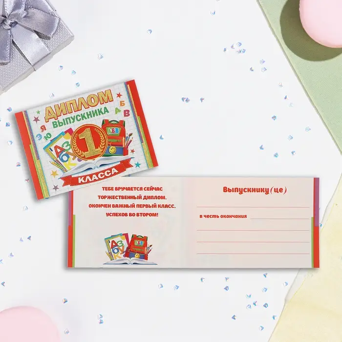 Диплом "Выпускника 1 класса" глиттер, школьная доска, портфель