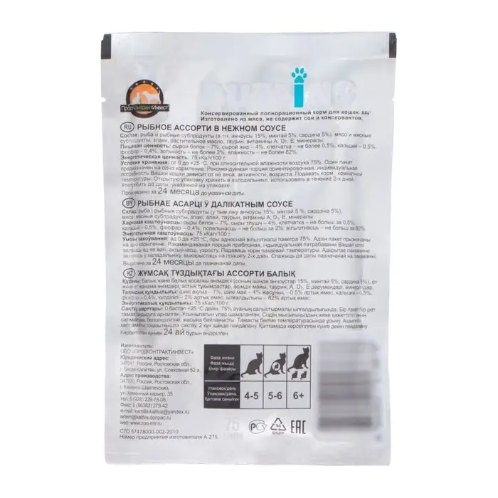 Влажный корм "Puffins" для кошек, рыбное ассорти в соусе, 75 г