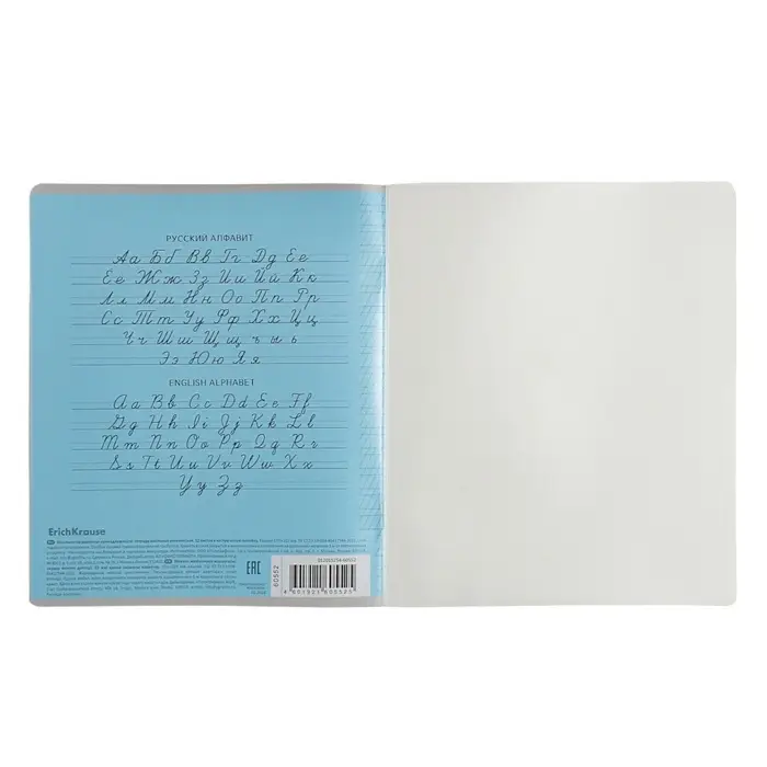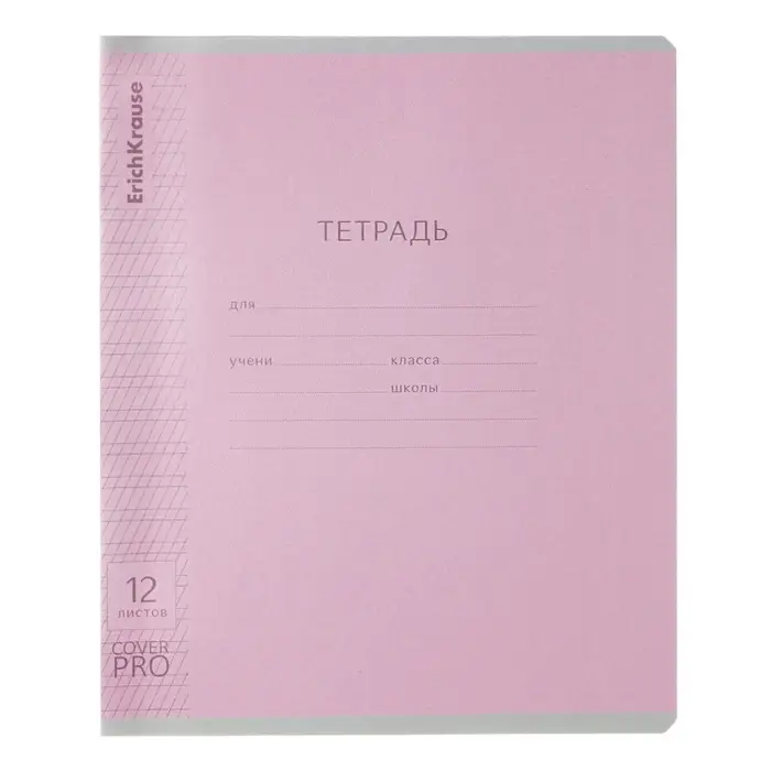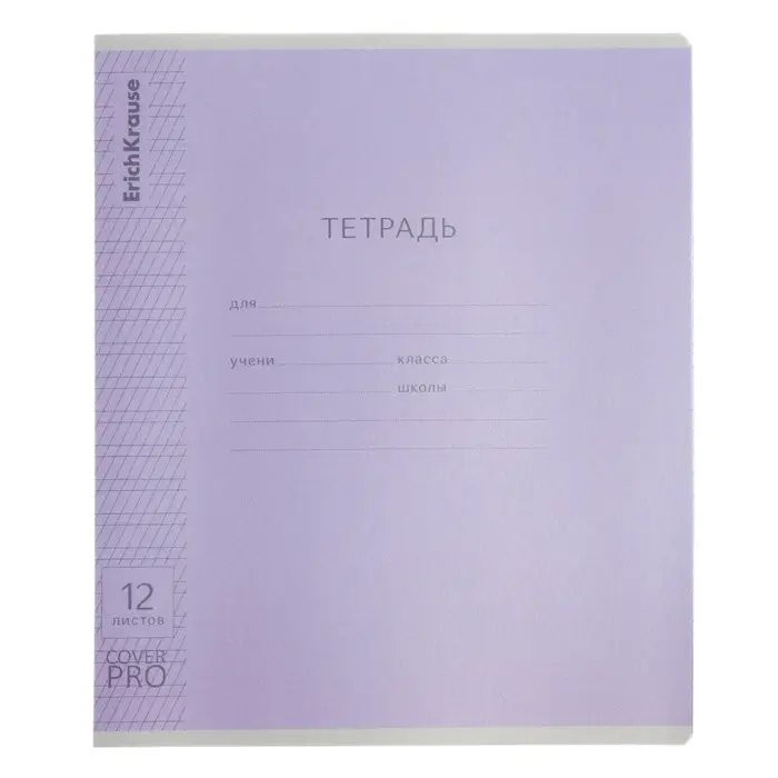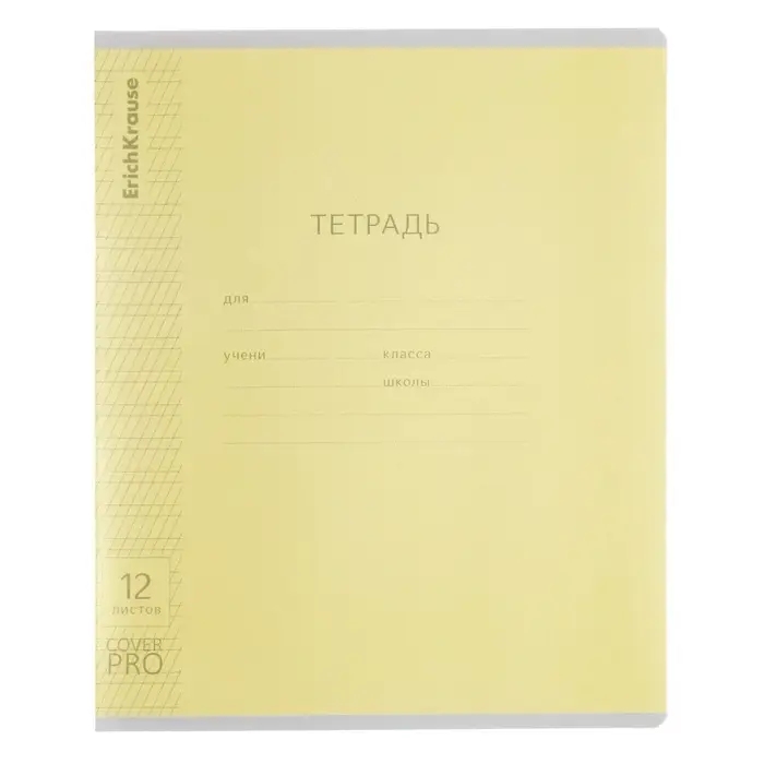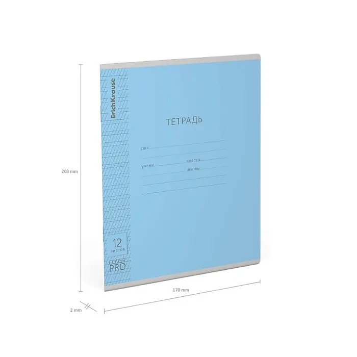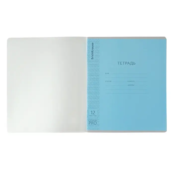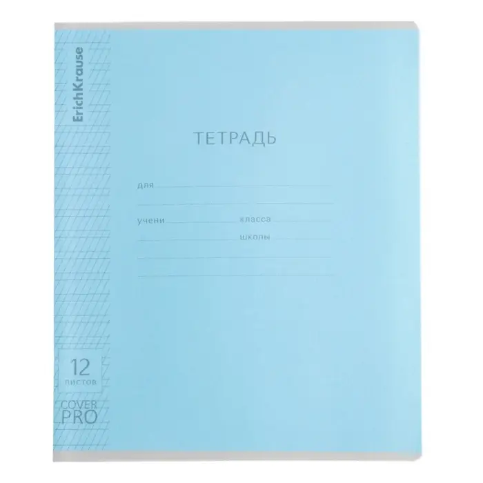 Тетрадь школьная ученическая формата А5+ (170x203 мм). Двойная обложка: внешняя выполнена из высококачественного износостойкого прозрачного пластика с фактурой «апельсиновая корка», внутренняя — из качественной мелованной бумаги. В блоке 12 листов в частую косую линейку. Бумага офсетная плотностью 60 г/м2. Цвет линовки — синий. Скругленные уголки обложки и блока. Тип скрепления — скоба. Тетради разных дизайнов упакованы в термоусадочную пленку по 10 штук.