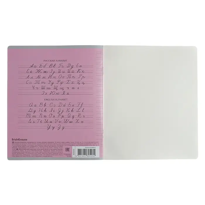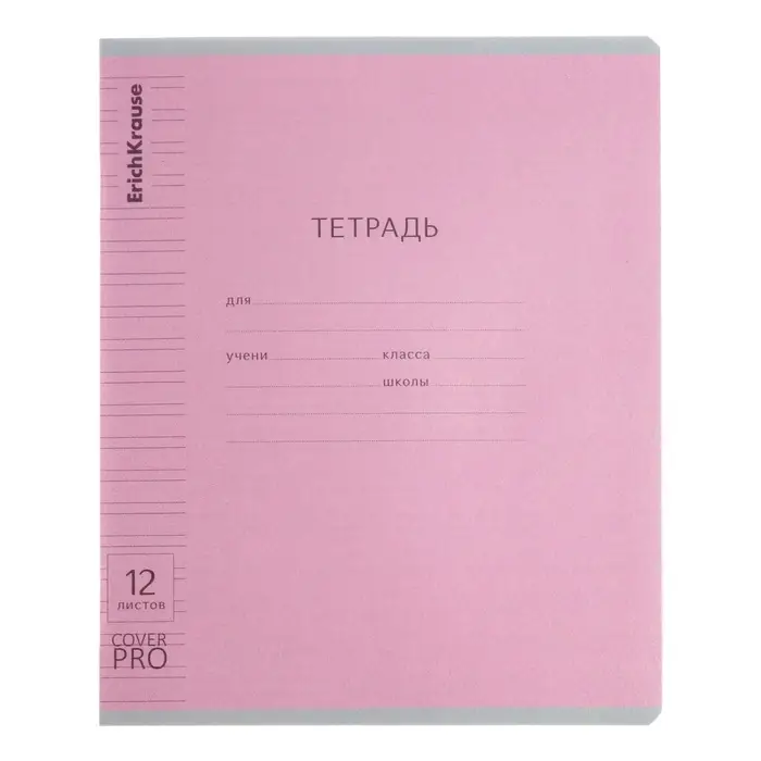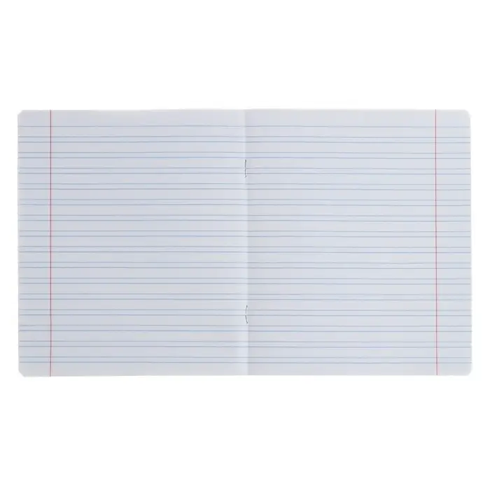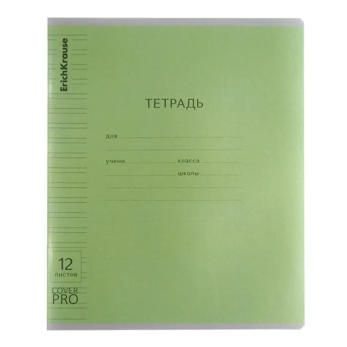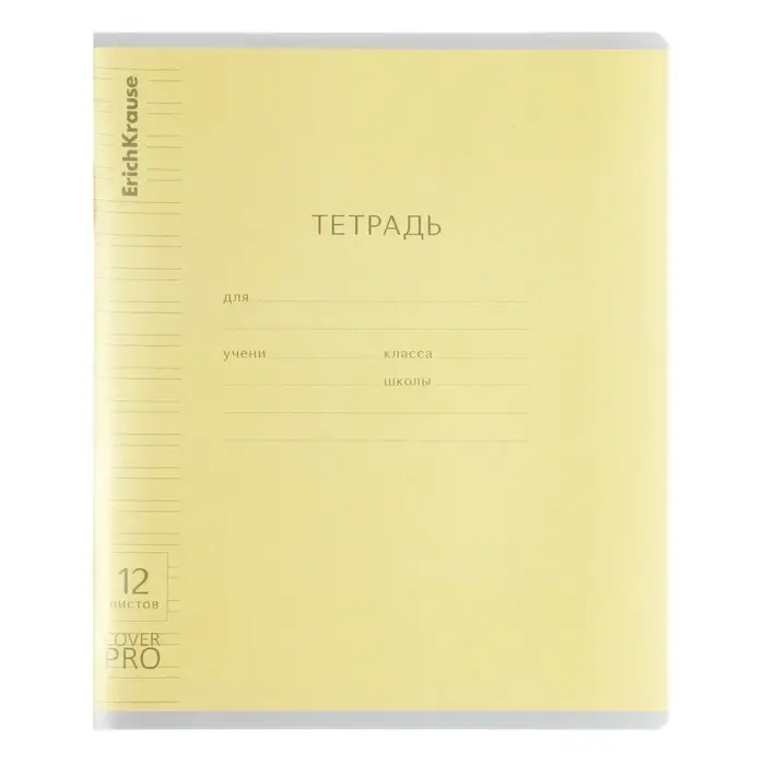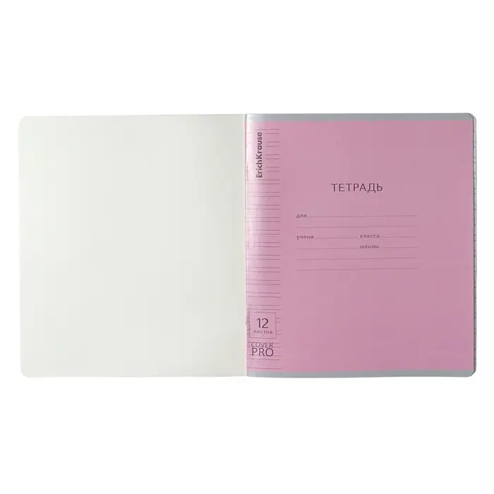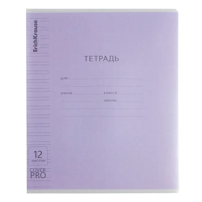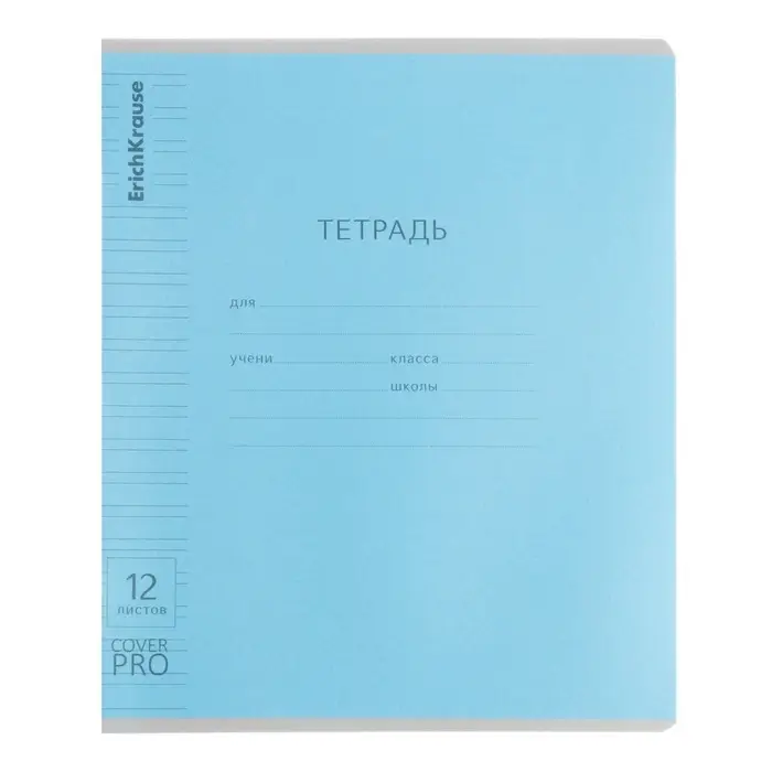 Тетрадь школьная ученическая формата А5+ (170x203 мм). Двойная обложка: внешняя выполнена из высококачественного износостойкого прозрачного пластика с фактурой «апельсиновая корка», внутренняя — из качественной мелованной бумаги. В блоке 12 листов в узкую линейку. Бумага офсетная плотностью 60 г/м2. Цвет линовки — синий. Скругленные уголки обложки и блока. Тип скрепления — скоба. Тетради разных дизайнов упакованы в термоусадочную пленку по 10 штук.