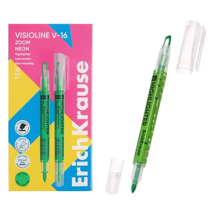 Двухсторонний текстмаркер ErichKrause Visioline V-16 Zoom Neon, цвет чернил зеленый (в коробке по 12 шт.)