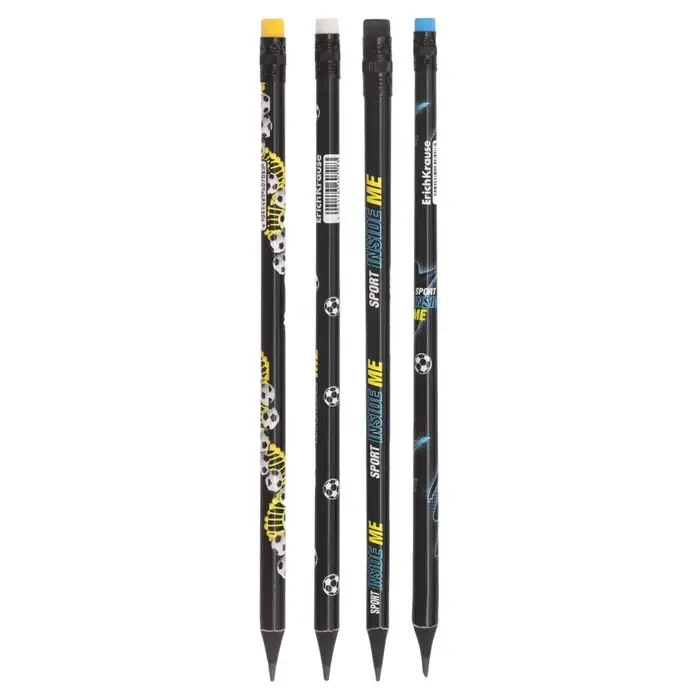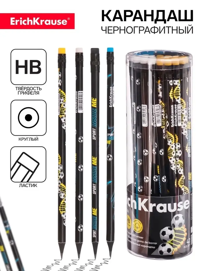 Карандаш чернографитный с ластиком ErichKrause «Sport DNA», НВ, грифель d=2.2 мм, пластик, круглый в тубусе, МИКС