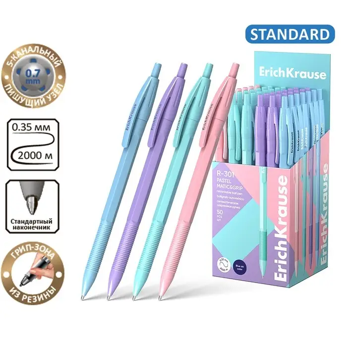 Ручка шариковая автоматическая, ErichKrause R-301 Matic&Grip Pastel, узел 0.7 мм, чернила синие, длина линии письма 2000 метров