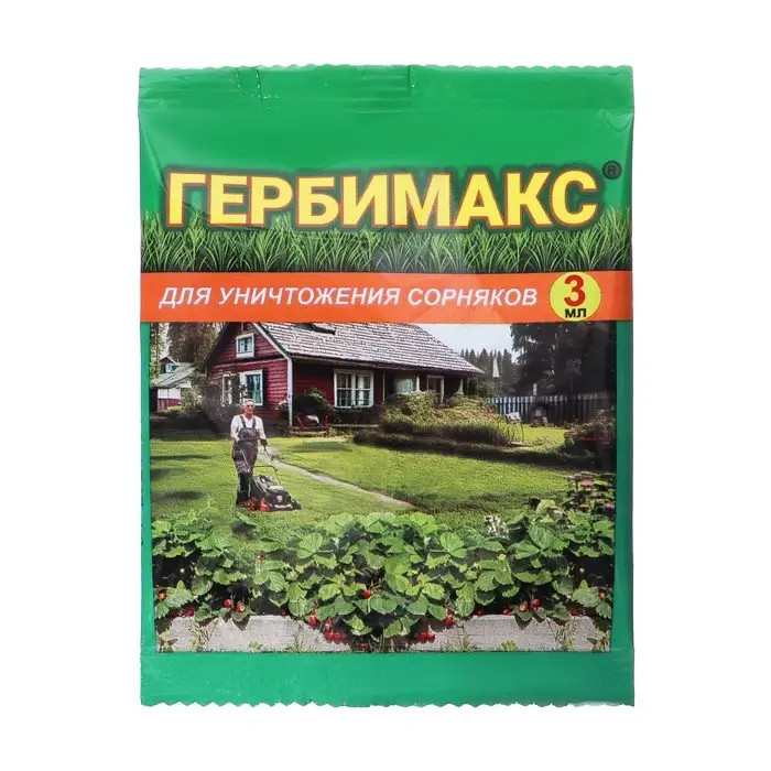 Гербимакс (Действующее вещество 300г/л Клопирамид) — усердный помощник садовода, который позволит получить идеальный газон при минимальных затратах времени. Гербицид избирательного действия. Клопиралид эффективно уничтожает двудольные сорняки: многолетние (одуванчик, осот, подорожник) и однолетние (ромашку, гречишку, горец), при этом совершенно безвреден для однодольных растений (к ним как раз и относятся газонные травы). Гербицид дает наибольший эффект при обработке молодых вегетирующих растений. Даже для многолетних сорняков достаточно одной обработки за сезон, поскольку действующее вещество проникает в ткани и корни растения, уничтожая точку роста. Дополнительный бонус — возможность обработки посадок клубники после сбора урожая. Обработка гербицидом освобождает от утомительной прополки и позволяет дачнику отдохнуть, насладившись плодами своих трудов!