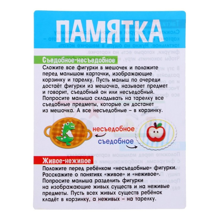 Занятия с обучающими карточками познакомят малыша с понятиями «съедобное» и «несъедобное» и помогут развить память, интеллект, зрительное и слуховое восприятие.