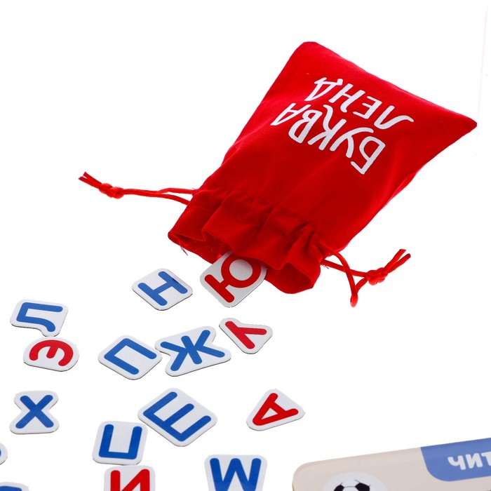 Внутри вы найдёте 60 магнитов, с которыми малыш сможет выучить алфавит и научится составлять слова.