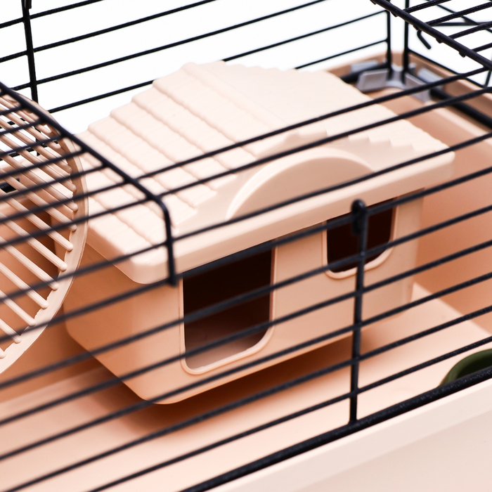 В таком жилище питомцу будет очень комфортно перемещаться из домика к кормушке и к беговому колесу.