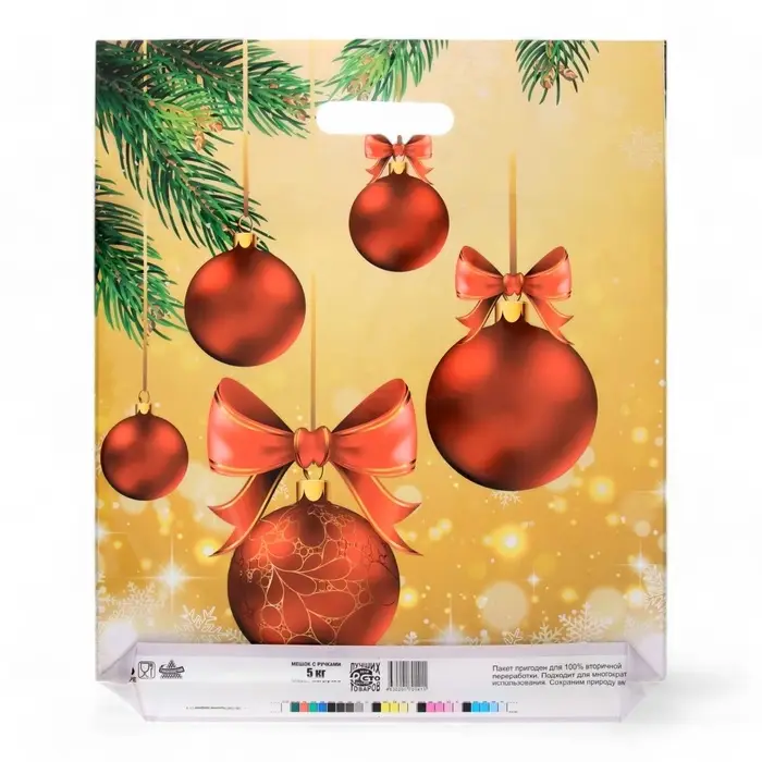 Однако, самое главное в этом пакете – это его уникальный дизайн. Выполненный в традиционных новогодних цветах, он украшен яркими рисунками снежинок, елочных игрушек и других символов Нового года.