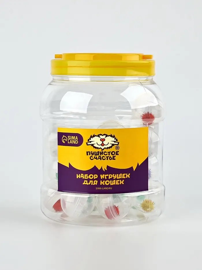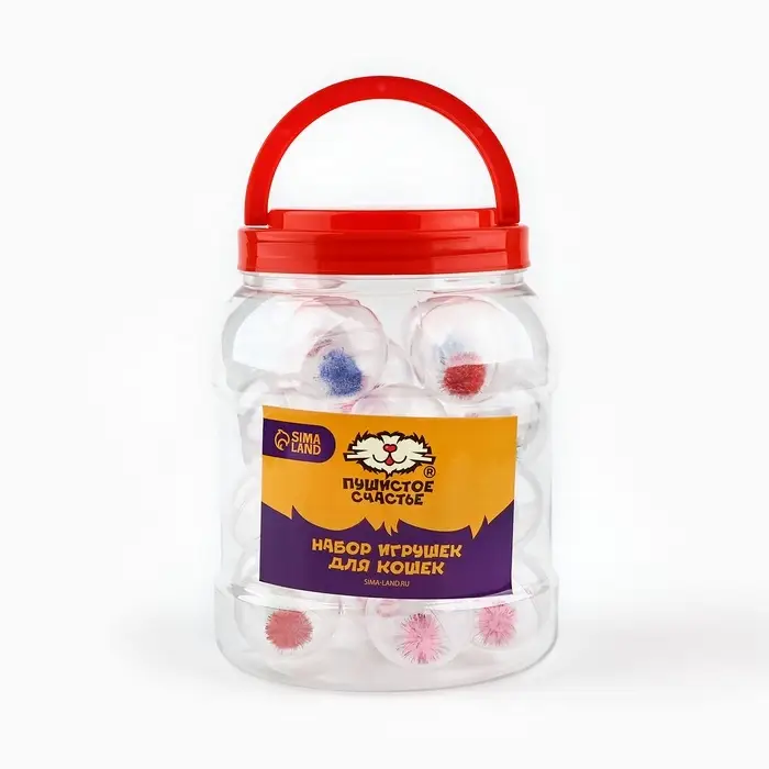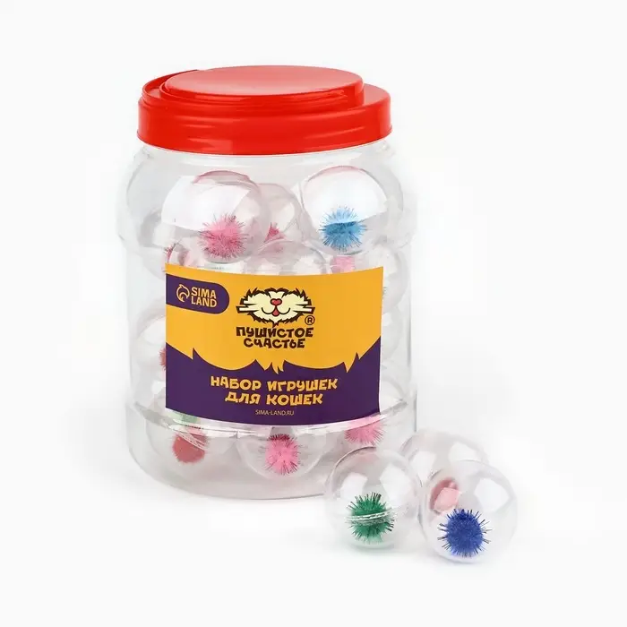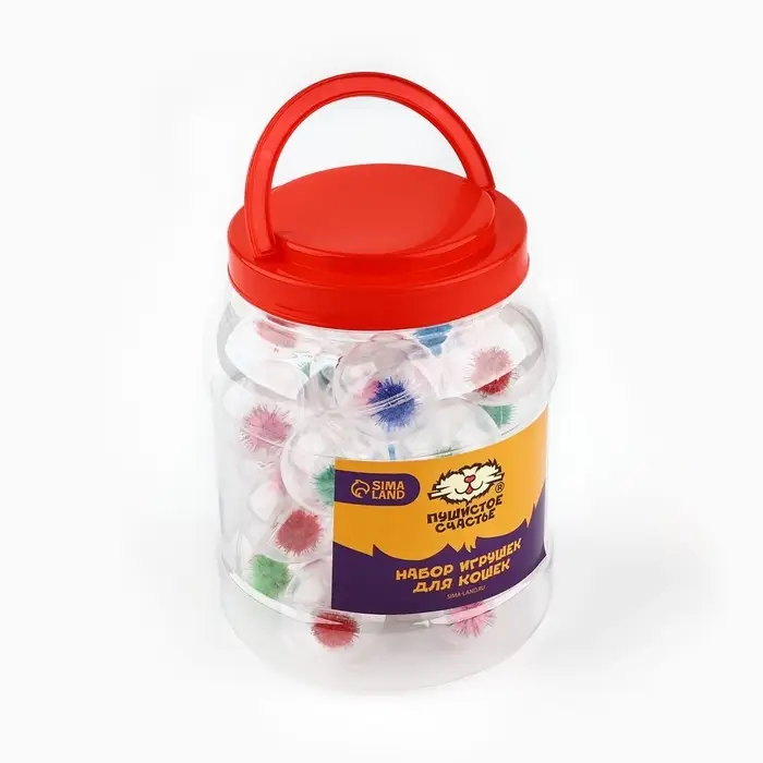 Шарик для кошек с помпошкой, 4 см, фасовка в банку по 25 шт, МИКС