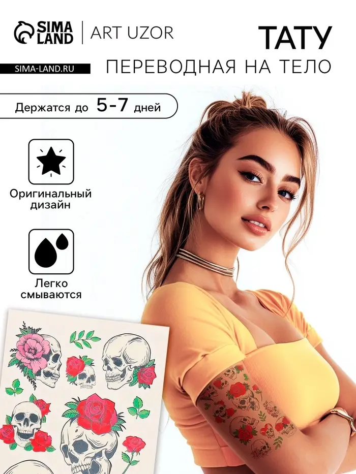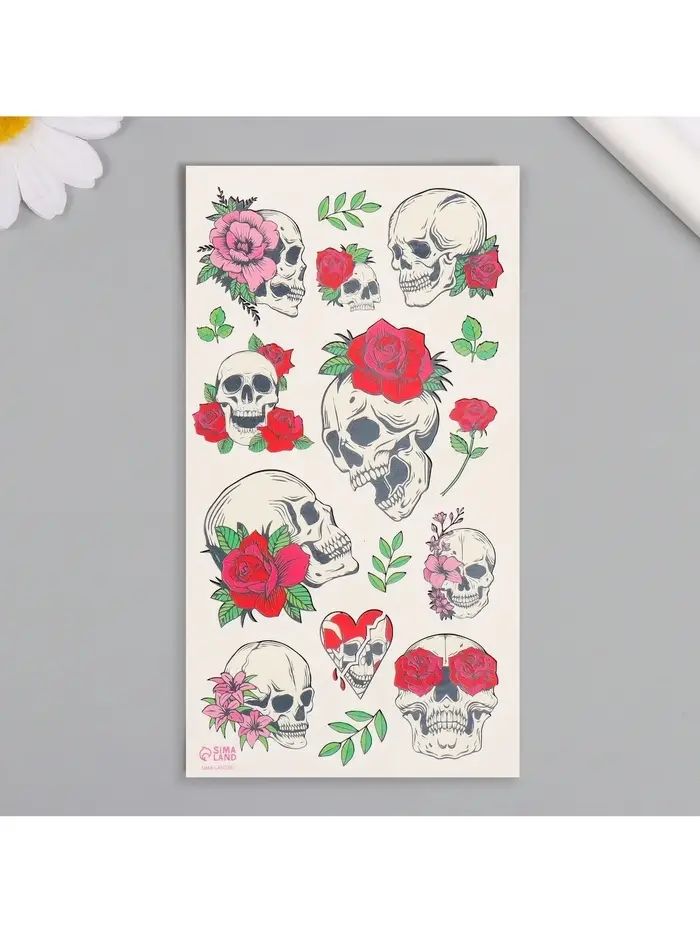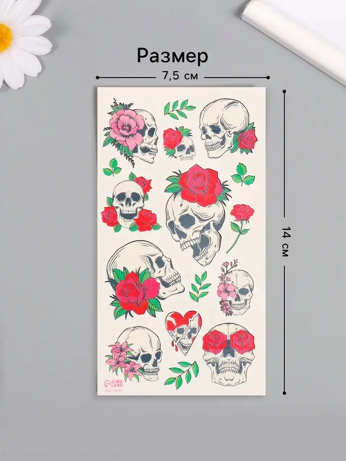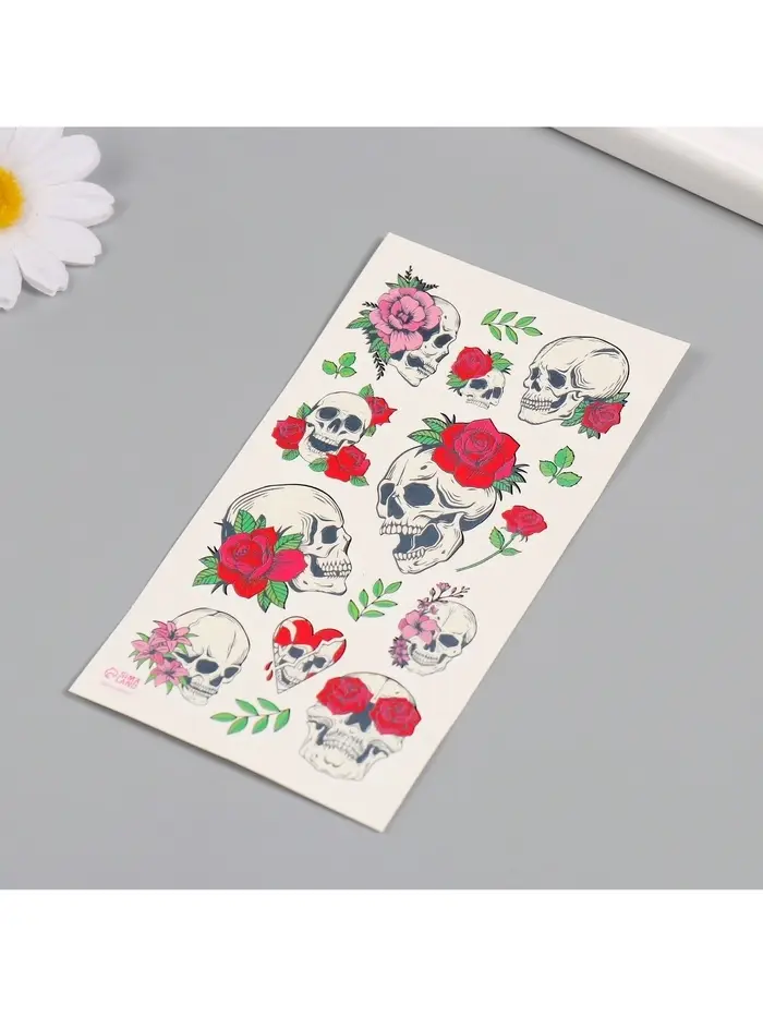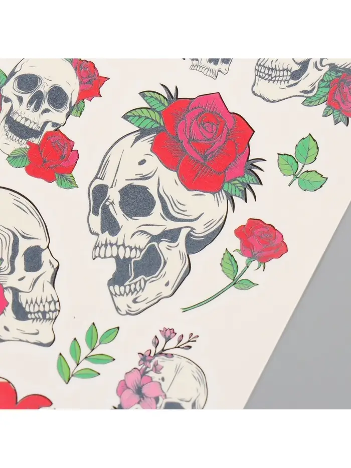 Переводные тату на тело цветные «Черепа и розы», 7.5×14 см