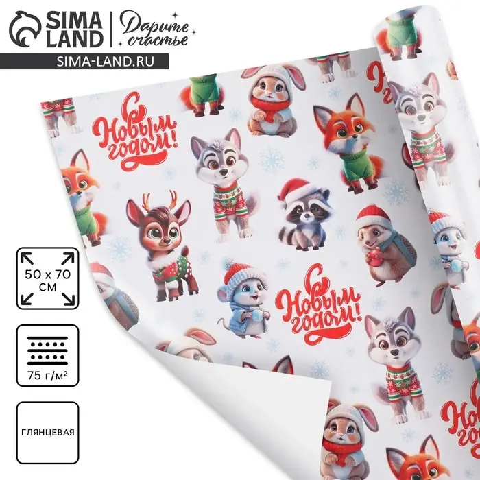Упаковочная бумага на новый год «Новогодние зверушки», 50 х 70 см, глянцевая