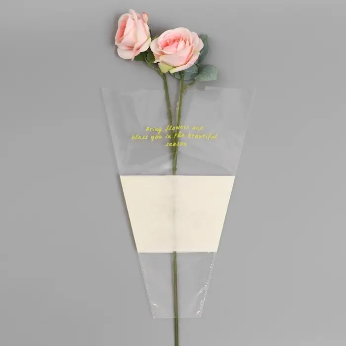 - Практичная конструкция: Нетканый внутренний слой скрывает стебли, а прозрачная часть демонстрирует красоту цветов. Материал защищает букет и сохраняет его свежесть.