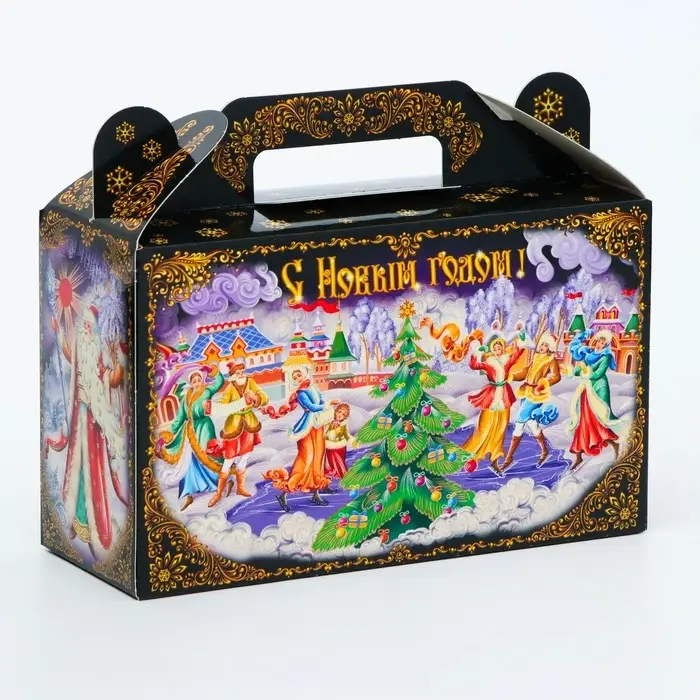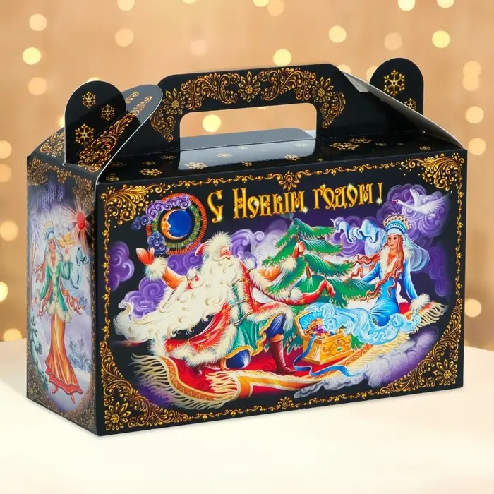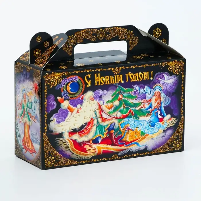 Коробка выполнена из качественных материалов, которые обеспечивают сохранность содержимого. Она имеет яркий и красочный дизайн, который отражает атмосферу Нового года.
