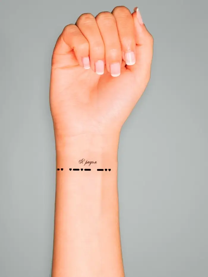 Добавьте загадочное сообщение на своей коже! Татуировка на запястье «Азбука Морзе — Я рядом» — это стильный аксессуар, придающий вашему образу уникальность. Чёрная тату в виде браслета передает таинственное послание с помощью азбуки Морзе, что станет ярким акцентом на любом мероприятии или в повседневной жизни.