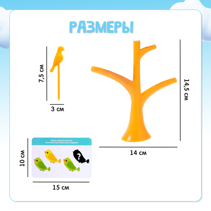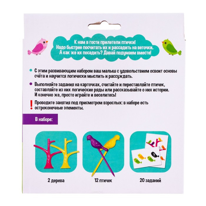 Покажите малышу, как рассаживать птичек на ветках. Ребёнку необходимо играть под присмотром взрослых. В наборе есть остроконечные элементы.