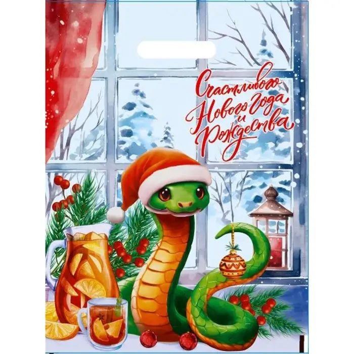Новогодний полиэтиленовый пакет с вырубной ручкой, украшенный символом года – изящной змеёй, идеально подойдёт для подарков и праздничных покупок.